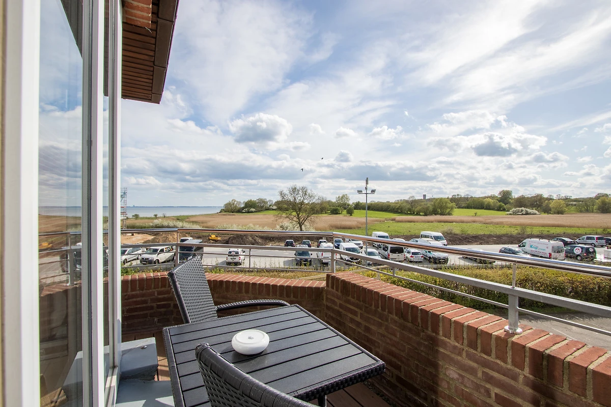 Balkon mit Blick über die Ostsee, den Hafen und das Naturschutzgebiet: Sitzgarnitur