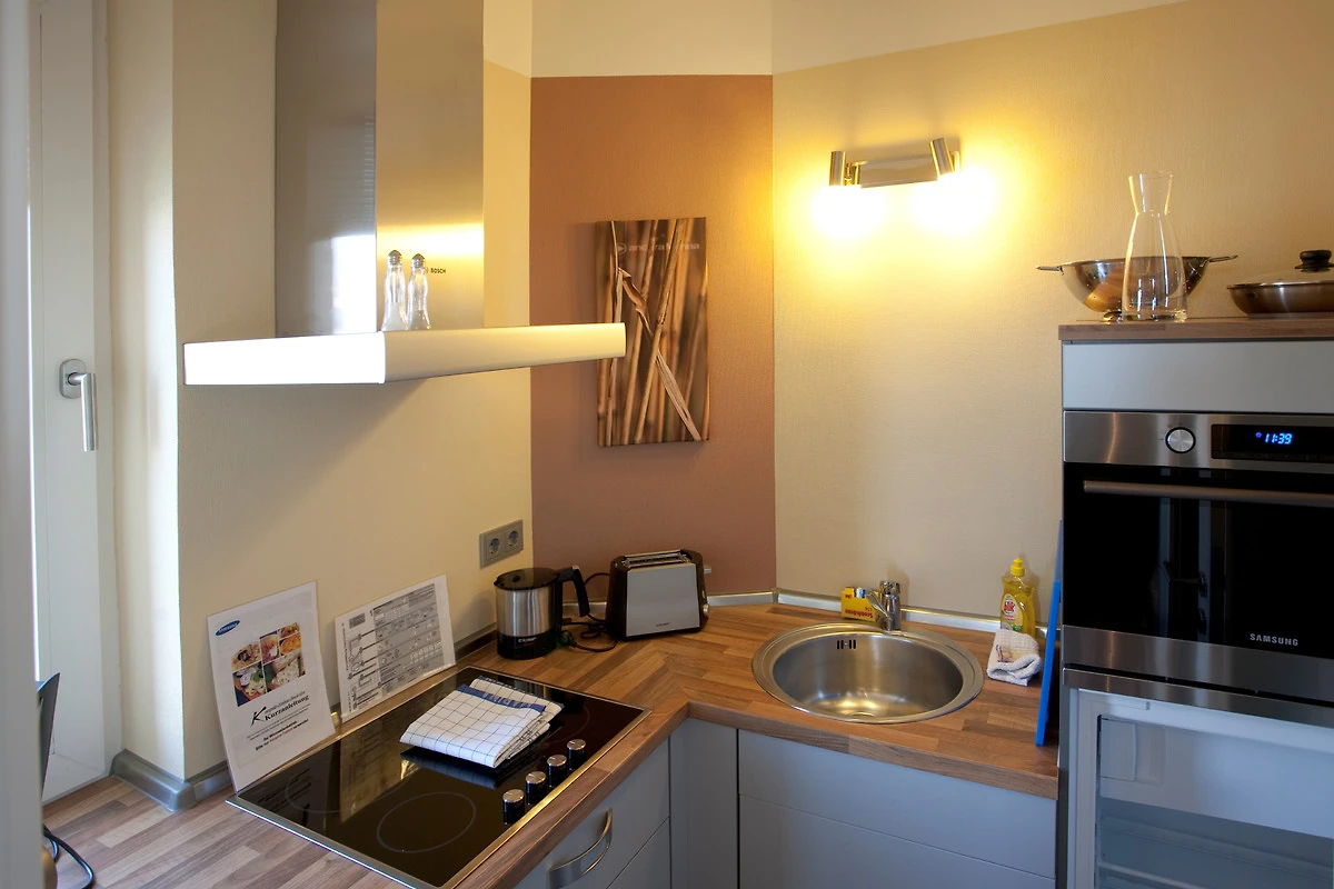 Über 29 m² bieten wir Ihnen in der 2. Etage den Komfort für zwei Personen, den Sie von einem erholsamen und wirklich besonderen Urlaub erwarten. Das Wohnzimmer ist ausgestattet mit zwei gemütlichen Einzelsesseln, einem Essplatz für zwei Personen (Esstisch vergrösserbar) sowie einem elektrisch ausfahrbaren Doppelbett 1,80 x 2,00 m, das auf Wunsch und Knopfdruck unsichtbar wird. In der Küche steht u.a. ein Geschirrspüler zur Verfügung sowie Kühlschrank mit TK-Fach, Mikrowelle mit Backfunktion, Wasserkocher, Toaster und Kaffeemaschine. Sofern Sie zwischendurch Wäsche machen möchten, so finden Sie Waschmaschine und Trockner in unseren Gemeinschaftsräumen (gegen Gebühr). Auf Wunsch stellen wir Ihnen auch gerne kostenlos ein Bügelbrett mit Bügeleisen zur Verfügung.