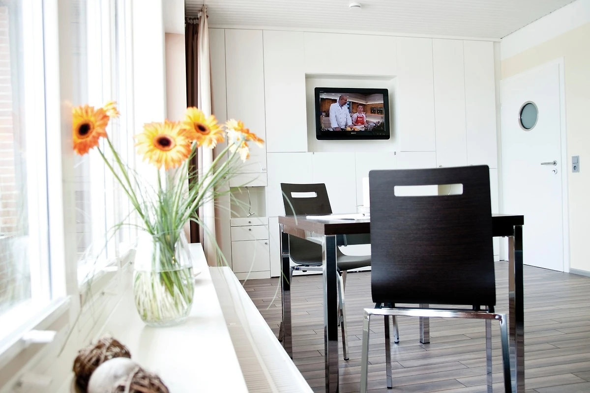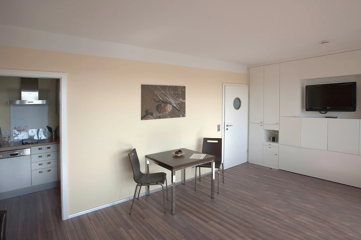 Über 32 m² bieten wir Ihnen in der 1. Etage den Komfort für zwei Personen, den Sie von einem erholsamen und wirklich besonderen Urlaub erwarten. Das Wohnzimmer ist ausgestattet mit zwei gemütlichen Einzelsesseln, einem Essplatz für zwei Personen (Esstisch vergrösserbar) sowie einem elektrisch ausfahrbaren Doppelbett 1,80 x 2,00 m, das auf Wunsch und Knopfdruck unsichtbar wird. In der Küche steht u.a. ein Geschirrspüler zur Verfügung sowie Kühlschrank mit TK-Fach, Mikrowelle mit Backfunktion, Wasserkocher, Toaster und Kaffeemaschine. Sofern Sie zwischendurch Wäsche machen möchten, so finden Sie Waschmaschine und Trockner in unseren Gemeinschaftsräumen (gegen Gebühr). Auf Wunsch stellen wir Ihnen auch gerne kostenlos ein Bügelbrett mit Bügeleisen zur Verfügung.