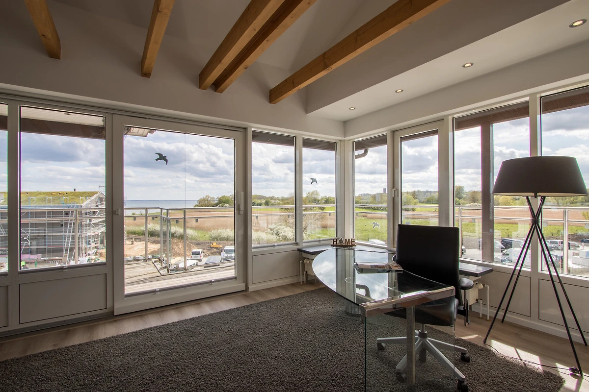 Hier oben in der 3. Etage, die Sie bequem mit Ihrem eigenen Fahrstuhl erreichen, haben Sie einen traumhaften Blick über Meer und Land, weisse Segelyachten und angrenzendes Naturschutzgebiet. Diese wirklich einmalige Aussicht auf die Lübecker Bucht wird Sie begeistern - ebenso wie die Ausstattung unseres Schmuckstückes.