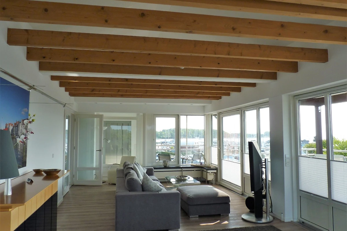 Im grossräumig geschnittenen Wohnzimmer haben Sie durch grosszügige Panoramafenster einen fantastischen Ausblick; machen Sie es sich mit einem guten Buch gemütlich auf der Couch oder geniessen Sie bei einem Glas guten Weines die maritime Stimmung vom fast rundum laufenden Balkon auf Sitz- oder Liegemöbeln. Wenn sich die Arbeit nicht umgehen lässt, kann diese vom vorhandenen Schreibtisch aus bequem erledigt werden.
