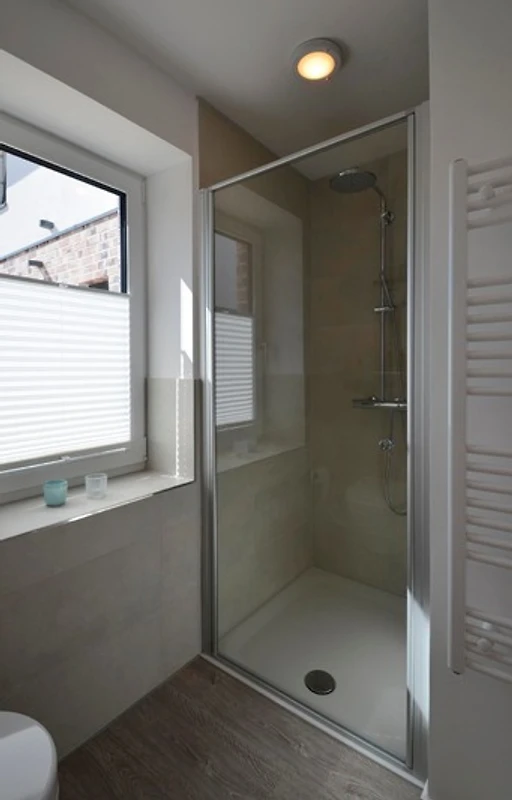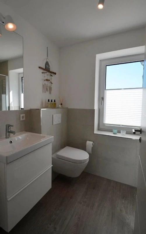 Das Badezimmer verfügt über ein Fenster und besticht durch seine hellen Fliesen. Es ist mit einer Dusche (RAINSHOWER), einem WC und einem Waschtisch mit Unterschrank ausgestattet.