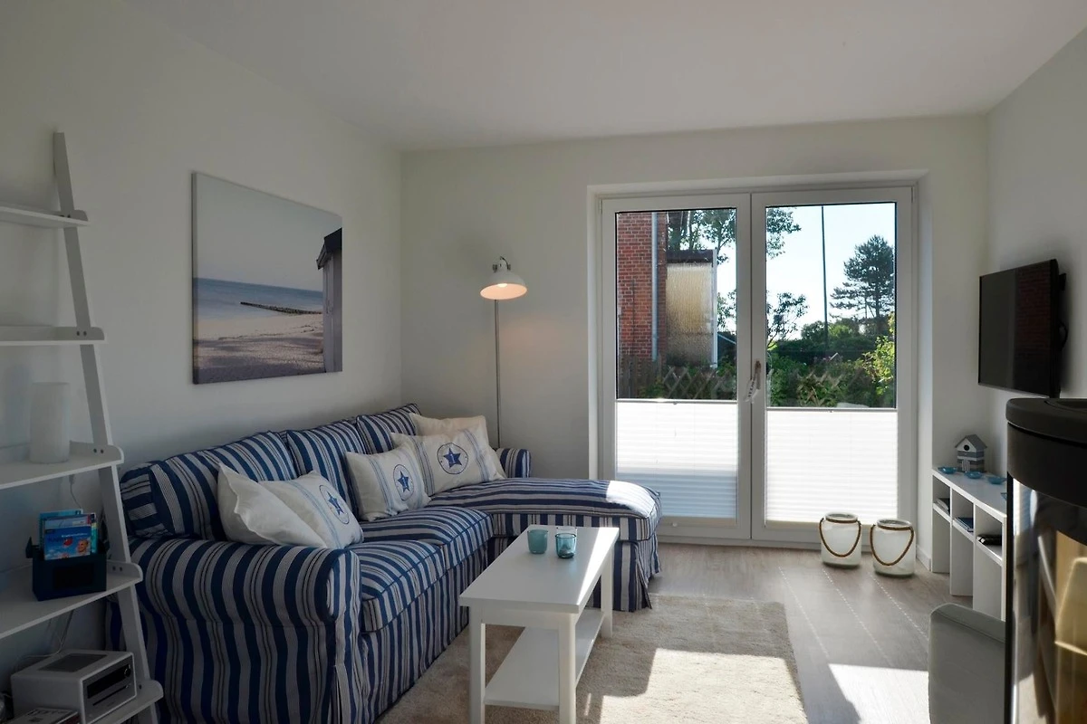 Der Wohnbereich mit Essplatz und Küchenzeile begeistert durch seinen MARITIMEN Einrichtungsstil. Das grosse, blau-weiss gestreifte ECKSOFA mit seinen VIELEN KISSEN sowie ein bequemer Sessel laden zum Verweilen, Entspannen und Lesen ein.