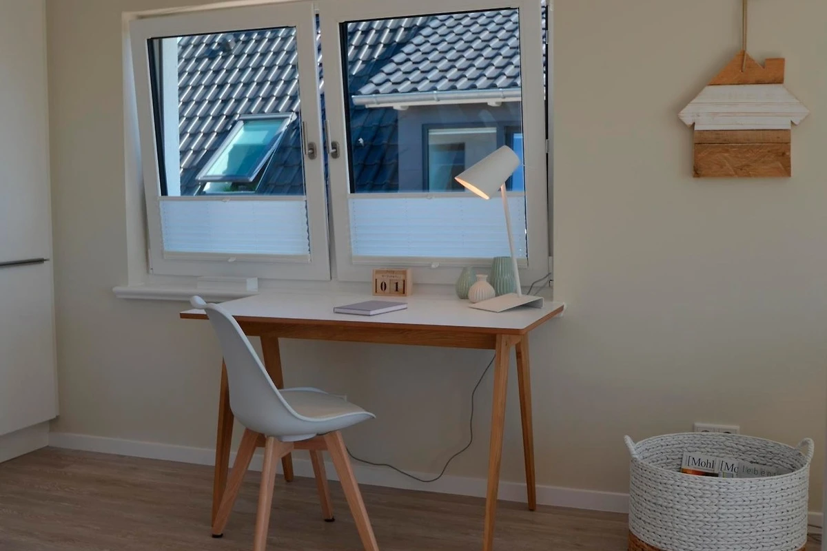 Der am Fenster platzierte Schreibtisch bietet den perfekten Platz, um seinen Gedanken freien Lauf zu lassen oder die Urlaubspost zu schreiben.