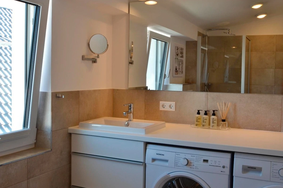 WASCHMASCHINE und TROCKNER befinden sich ebenfalls in diesem Raum. Selbstverständlich gibt es in der Wohnung auch einen Wäscheständer.