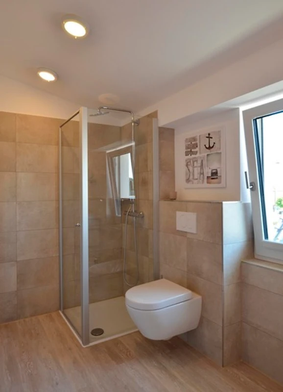 Dieses Bad besticht durch seine hellen Fliesen und eine geräumige Funktionalität. Es ist mit einer Dusche (RAINSHOWER), einer BADEWANNE, einem WC sowie einem Waschtisch mit Unterschrank ausgestattet.