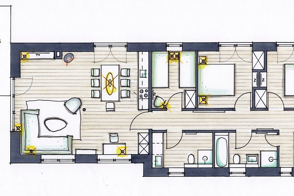 Gegenüber den Schlafzimmern befinden sich zwei Bäder, eines davon mit direktem Zugang zur Infrarotkabine.