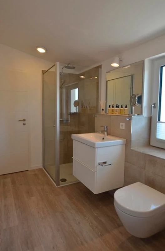 Das zweite Bad ist mit einer Dusche (RAINSHOWER), einem WC, einem Waschtisch mit Unterschrank, einem grossen Spiegel und einer Erstausstattung an Kosmetikartikeln ausgestattet.