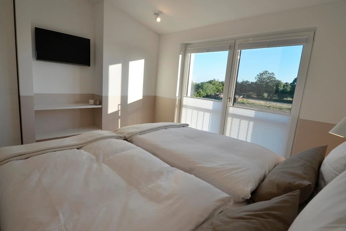 Dieses in Naturtönen gehaltene Schlafzimmer ist ebenfalls mit zwei getrennten BOXSPRINGBETTEN (90x200cm) und DAUNENDECKEN in ÜBERGRÖSSE (155x220cm) ausgestattet. Ein Verdunklungsrollo lässt insbesondere für die kleinen Gäste das Sonnenlicht draussen. In einem Standregal befindet sich eine kleine Auswahl an Büchern, Spielen und Spielzeug.