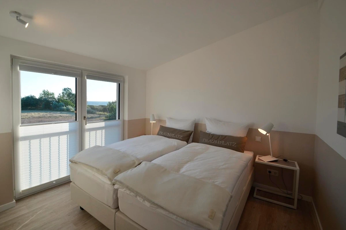 Das in Weiss und Beige gehaltene Schlafzimmer begeistert mit seinen bodentiefen Fenstern, die einen tollen BLICK auf die OSTSEE ermöglichen. Das komfortable BOXSPRINGBETT (180x200cm) und DAUNENDECKEN in ÜBERGRÖSSE (155x220cm) garantieren einen erholsamen Schlaf. VERDUNKLUNGSPLISSEES lassen auf Wunsch die Sonne draussen.