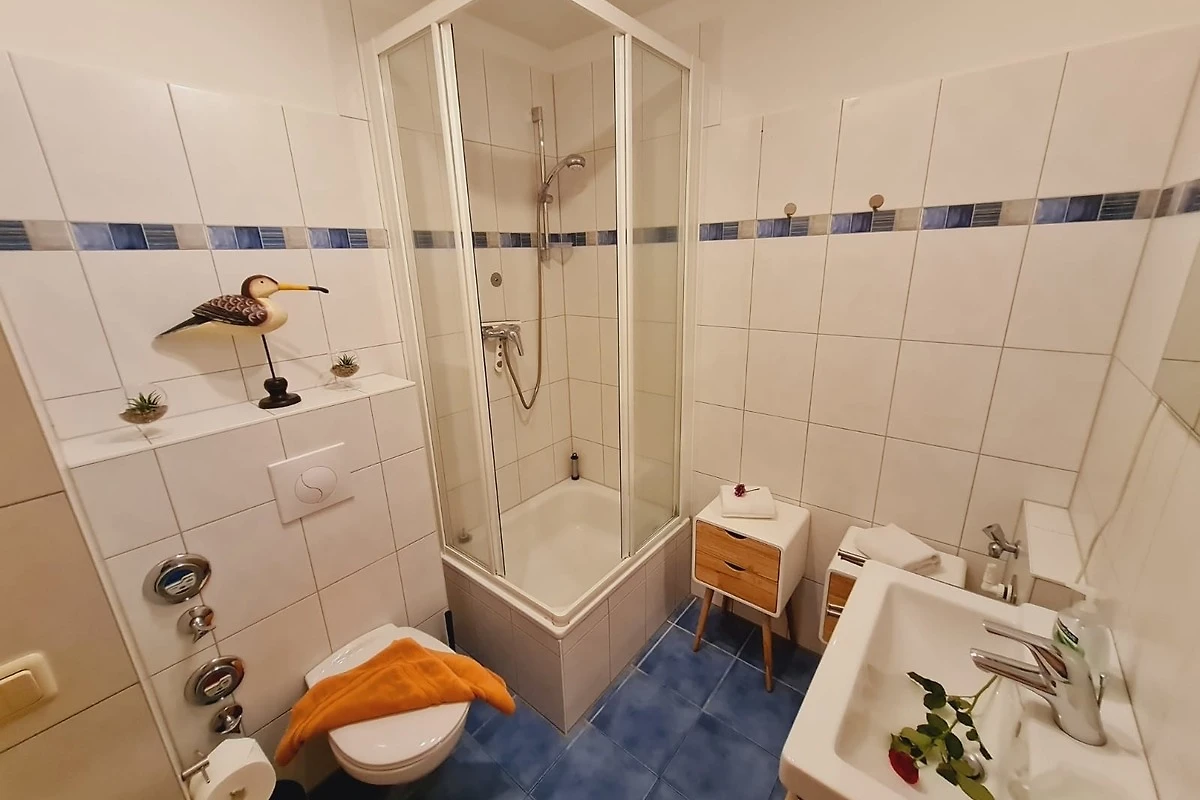 Bücher zum Schmökern und Vorlesen, Spiele für alle Altersstufen, CD`s, Reiseführer, Rad- und Wanderkarten, Regenschirme, Spielsachen für Kinder, Kindergeschirr. Für den Videorecorder ist eine grosse Videofilmsammlung für alle Altersstufen vorhanden. Das Duschbad bietet viele Ablageflächen.