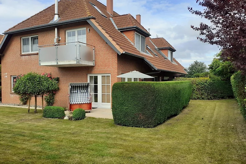 Zur Wohnung gehört eine neu gestaltete Südwest-Terrasse mit Gartenmöbeln, einem gemütlichen Strandkorb, Liegen, Sitzauflagen und einem Grill.