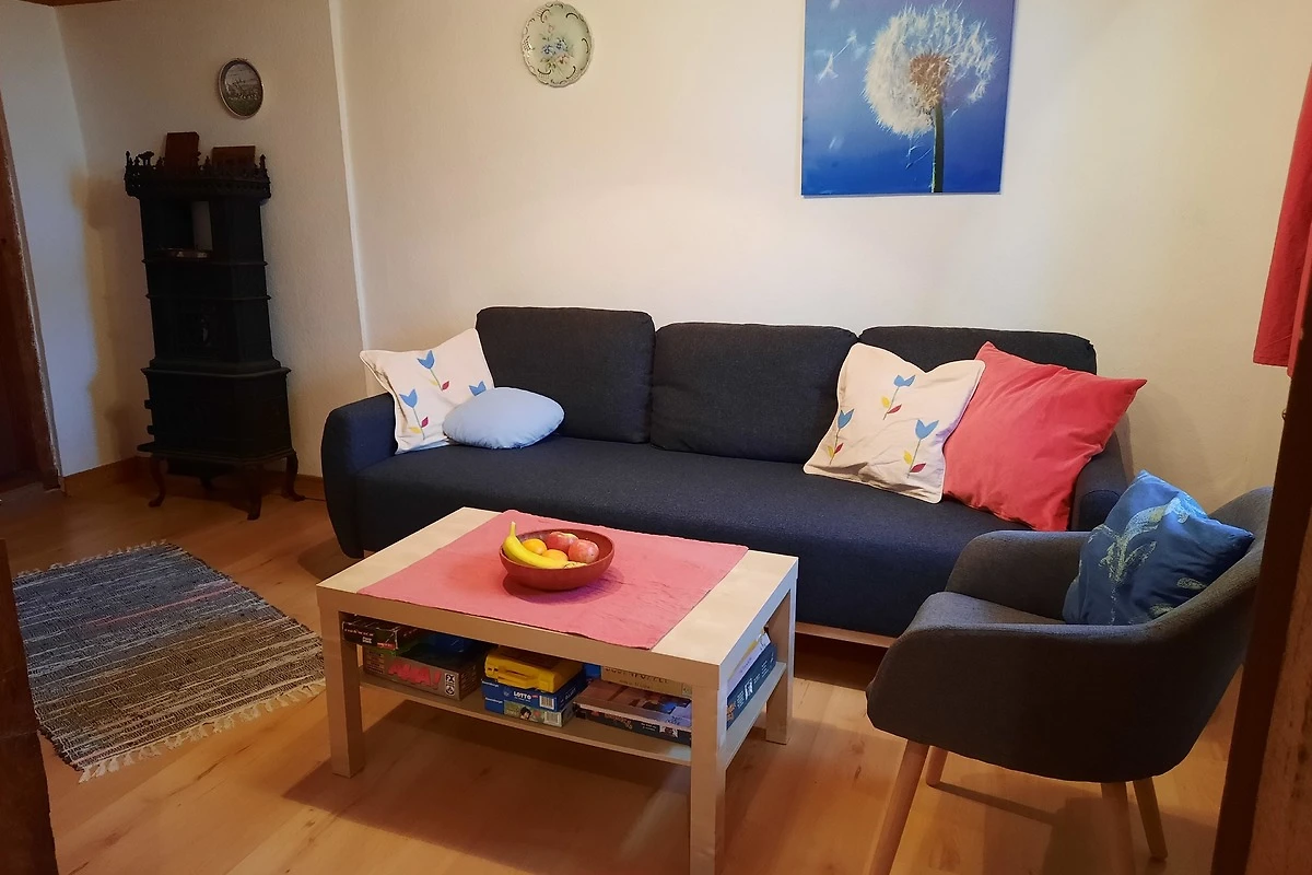 Im Erdgeschoss befinden sich Wohnküche mit Spülmaschine, Cerankochfeld und Backofen; Kaminofen; Badezimmer und Wohnzimmer mit ausziehbarer Schlafcouch. Die drei hellen, freundlichen und gemütlichen Schlafzimmer sind im oberen Stockwerk, wovon eines ein Durchgangszimmer ist.