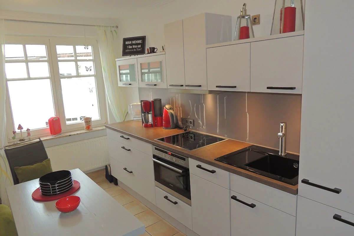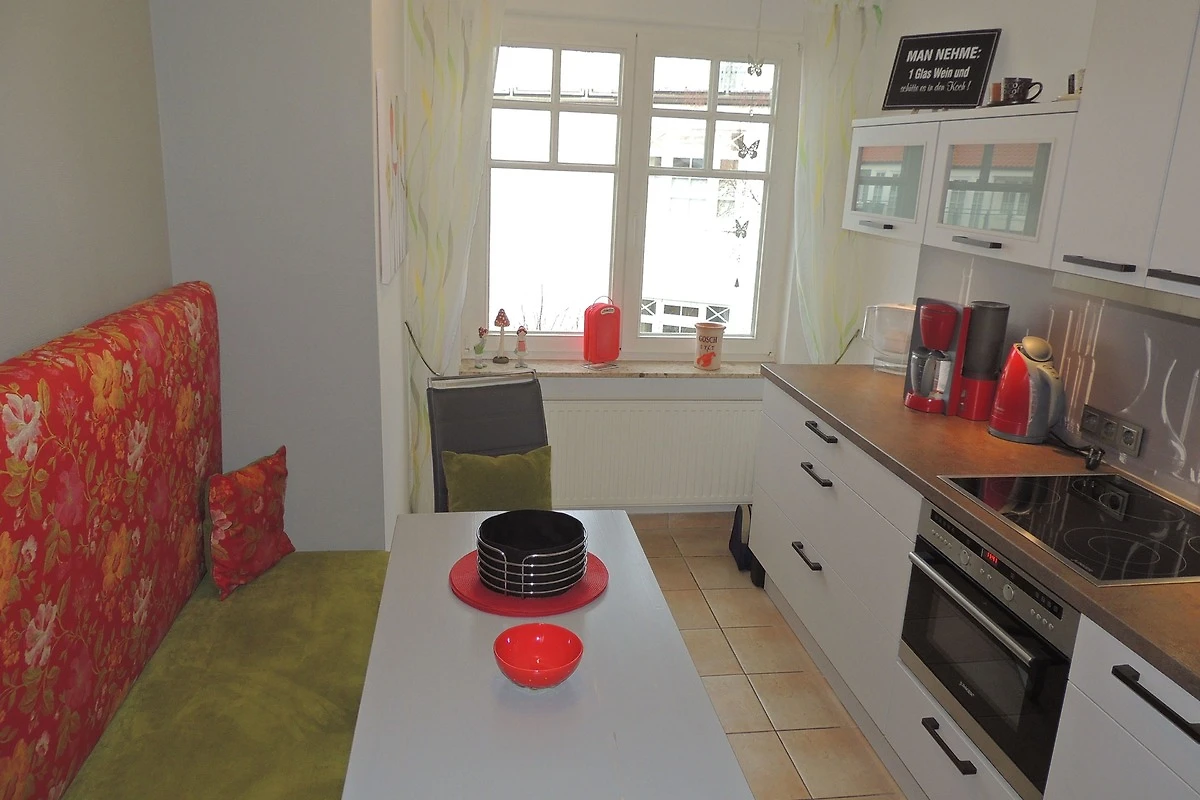 Die separate Küche beinhaltet alles, wie es ein Jeder von zu Hause kennt. Einbauküche mit Backofen, Ceranfeld, Kühlschrank, Gefrierschrank, Mikrowelle sowie sämtliche Klein-Elektrogeräte (Kaffeemaschine, Toaster etc.). Ein kleiner Elektrogrill für den Sommerabend auf dem Balkon ist ebenfalls vorhanden.