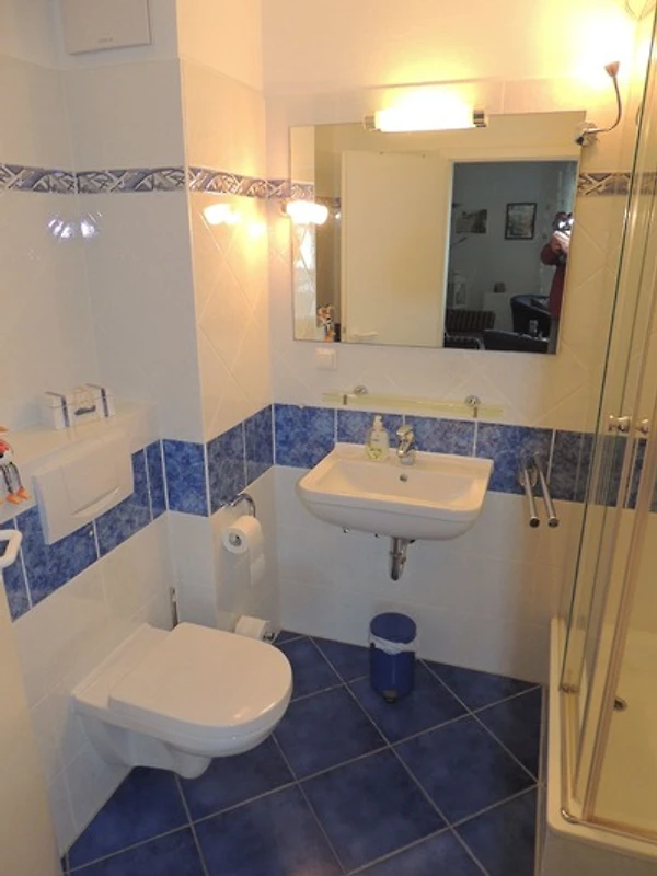 Im Badezimmer befindet sich eine Regendusche, WC und Waschtisch sowie eine Fussbodenheizung.