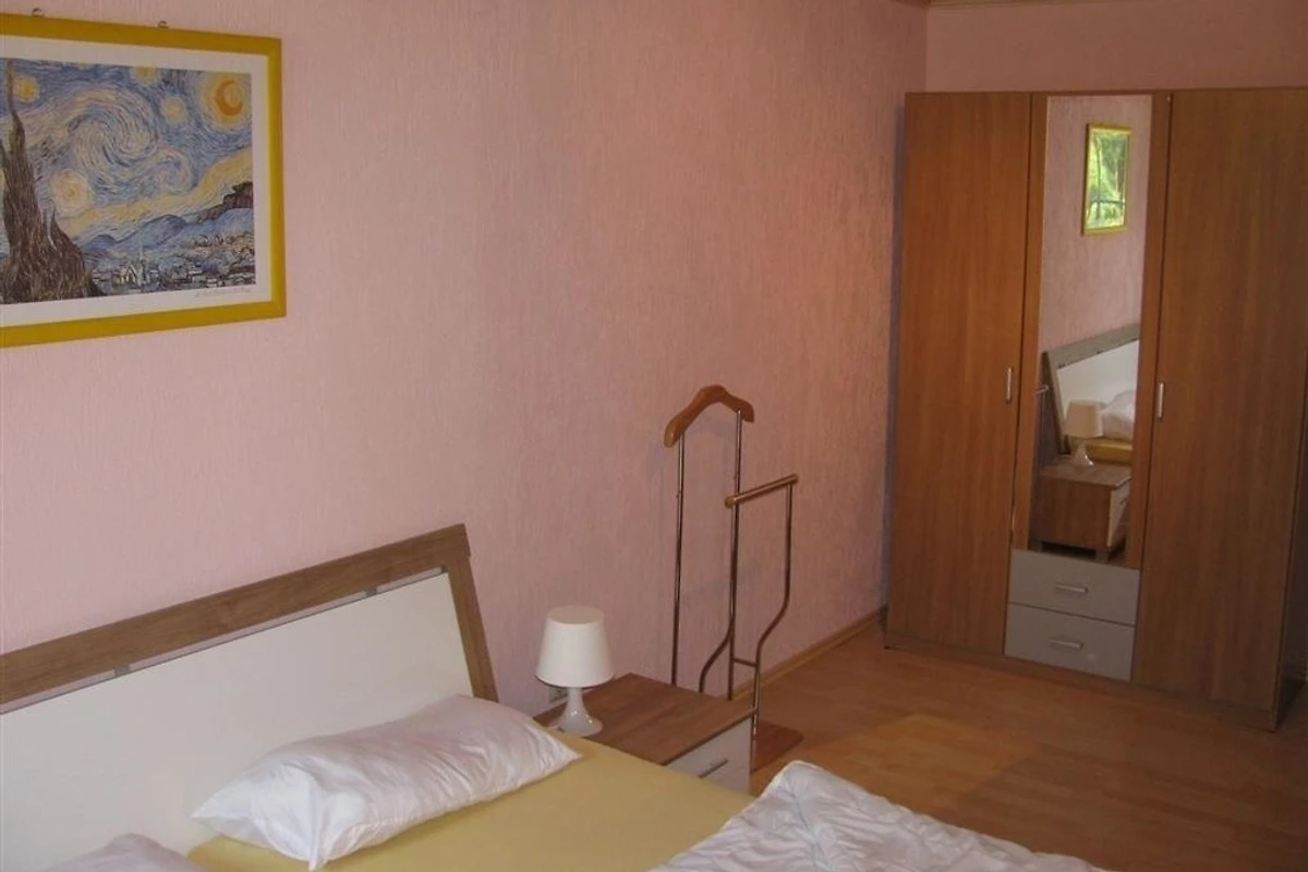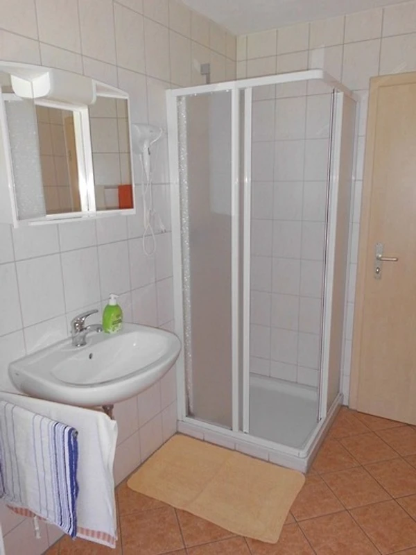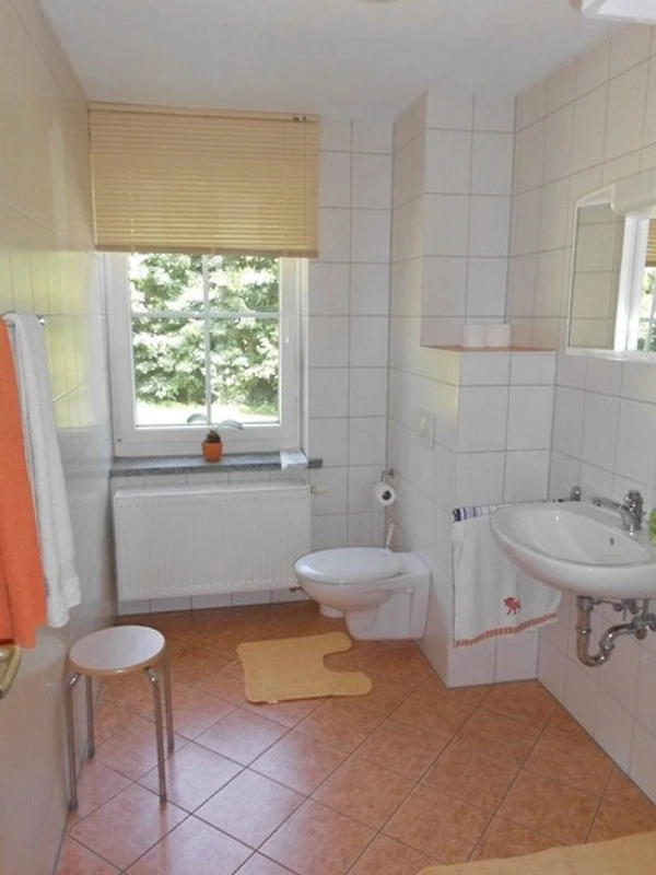 Die kleinere Ferienwohnung "Wolfsgrund" im 1. Obergeschoss ist ca. 37 qm gross und besteht aus einem kleinen Flur, einem Bad mit DU/WC, einem Schlafzimmer mit Doppelbett sowie einer grossen Wohnküche. In diesem Aufenthaltsraum gibt es einen eine kleine gut ausgestattete Küchenzeile mit Spüle, 2 Elektroherdplatten, Kühlschrank, Mikrowelle usw. sowie einem Tisch mit Stühlen, TV und einem Schlafsofa für 2 Personen.