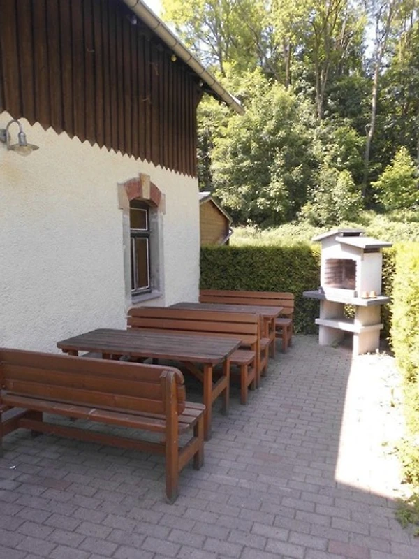 Die anliegende Terrasse bietet die Möglichkeit naturnah zu relaxen. Ein Grill sowie Gartentische und Bänke ermöglichen gemütliche Grillabende.