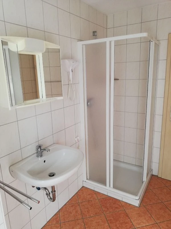 Die kleinere Ferienwohnung "Saydaer Höhe" im 2. Obergeschoss ist ca. 37 qm gross und besteht aus einem kleinen Flur, einem Bad mit DU/WC, einem Schlafzimmer mit Doppelbett sowie einer grossen Wohnküche. In diesem Aufenthaltsraum gibt es einen eine kleine gut ausgestattete Küchenzeile mit Spüle, 2 Elektroherdplatten, Kühlschrank, Mikrowelle usw. sowie einem Tisch mit Stühlen, TV und einem Schlafsofa für 2 Personen.