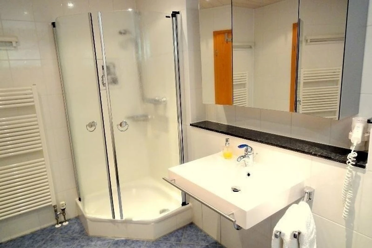 Badezimmer: Fussbodenheizung, Echtglasdusche, 3D-Spiegel, Waschmaschine, Haartrockner, Handtücher