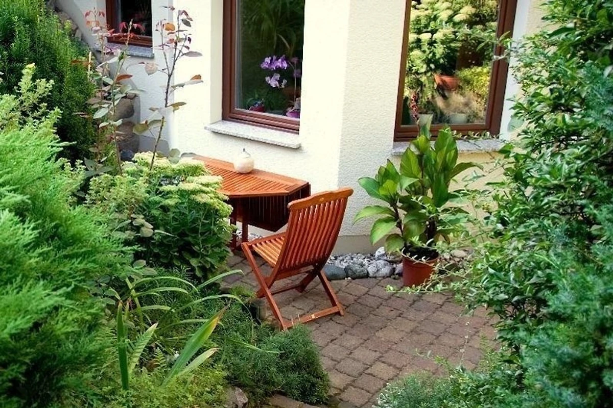 Die idyllische, sonnige Terrasse mit Holzgartenmöbeln lädt nach einem Ausflug zum Entspannen ein.
