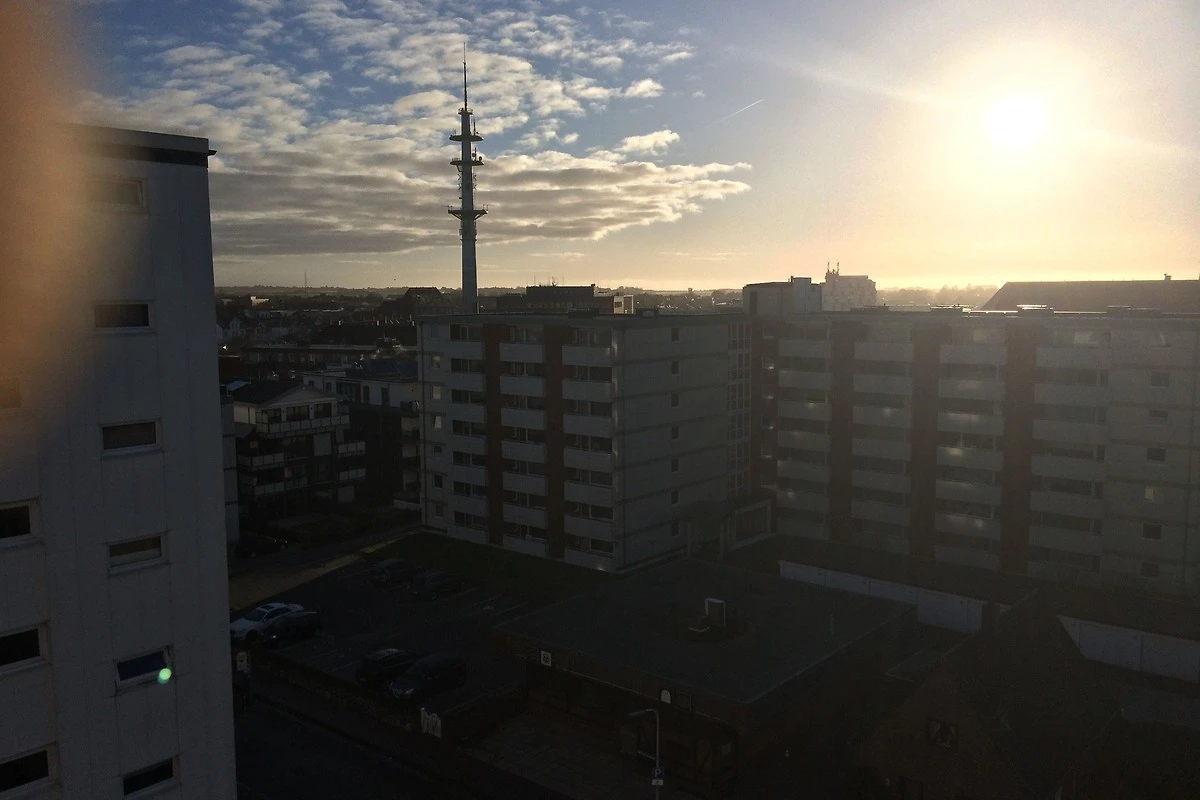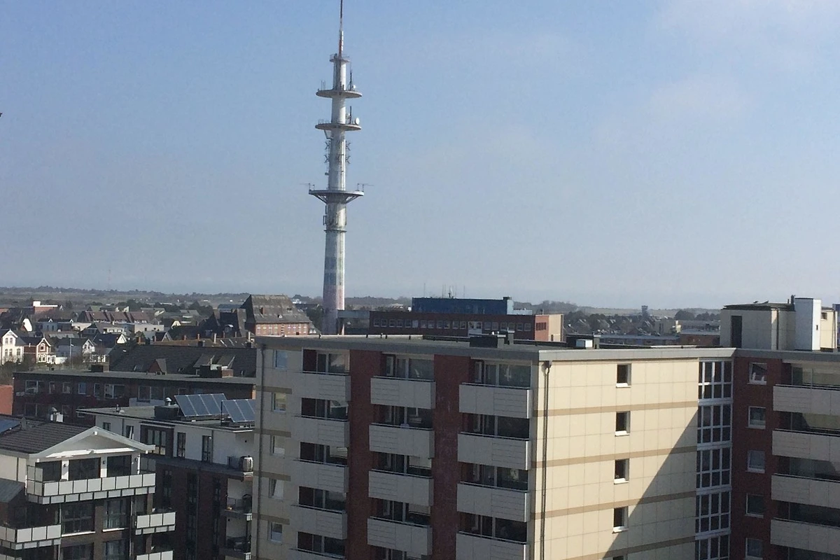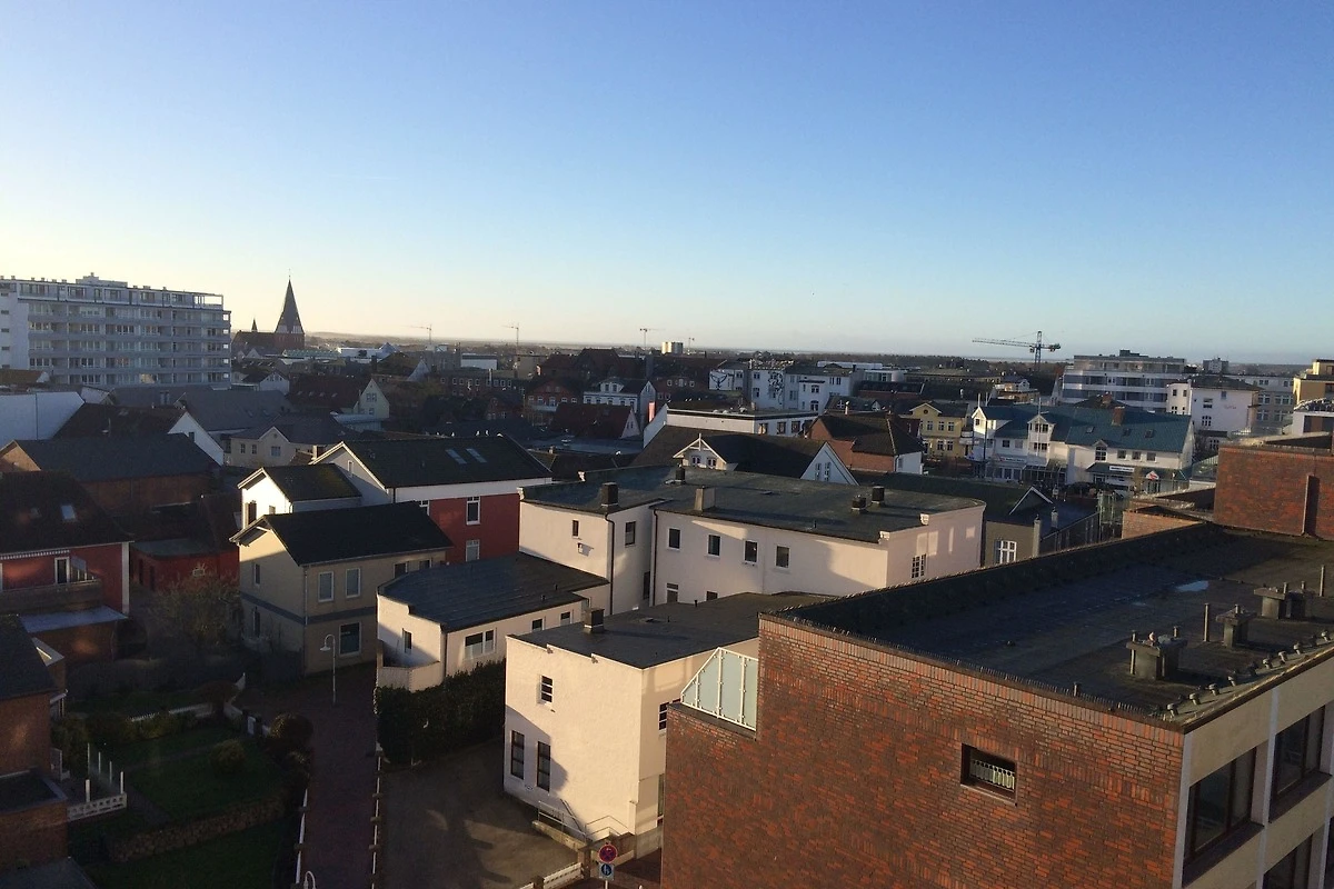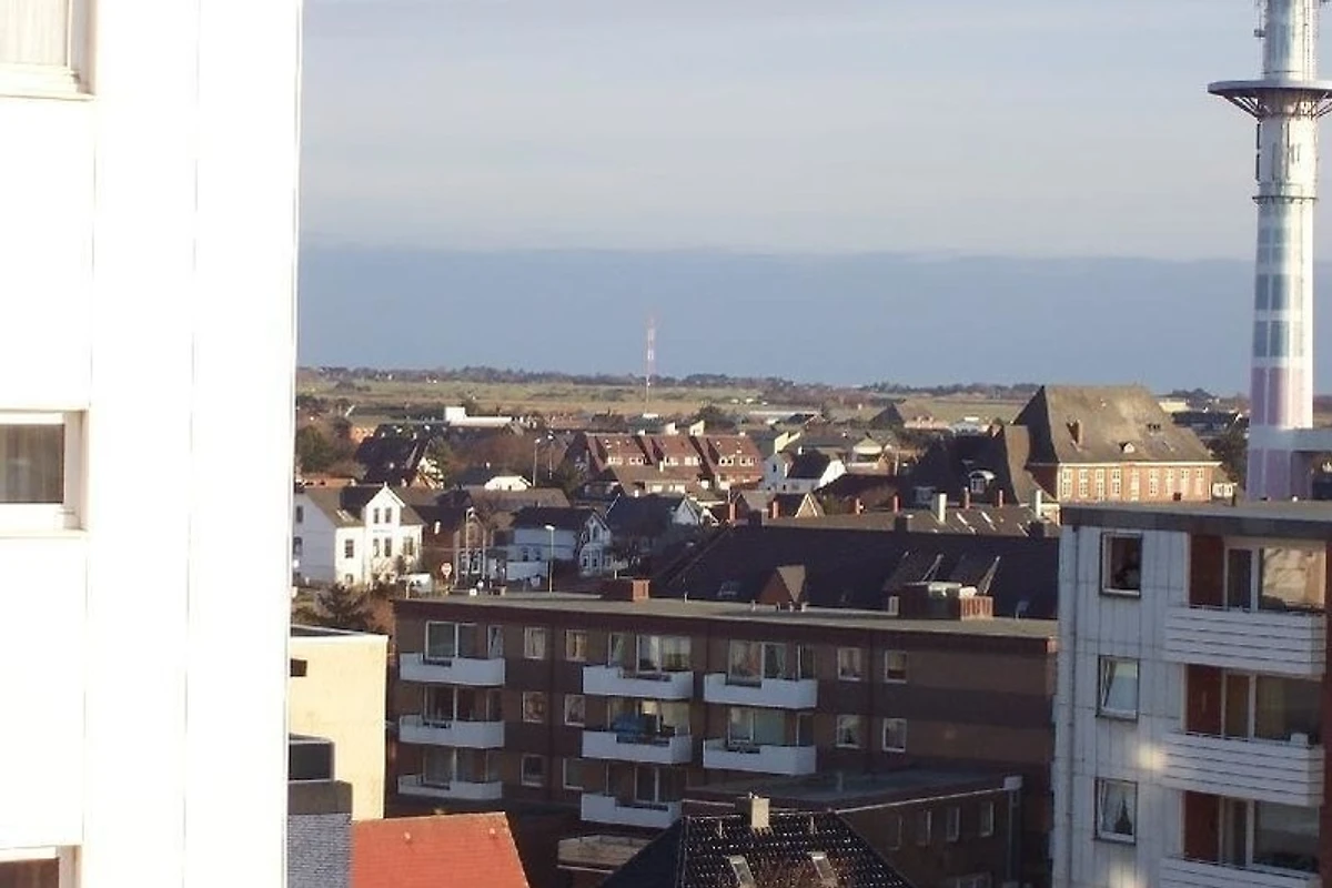 Die Loggia des Appartementes ist sehr geräumig und bietet zwei bequeme Sessel und einen Balkontisch. Sie geniessen vom 6. Stock einen herrlichen Blick über Westerland in Richtung Wattenmeer.