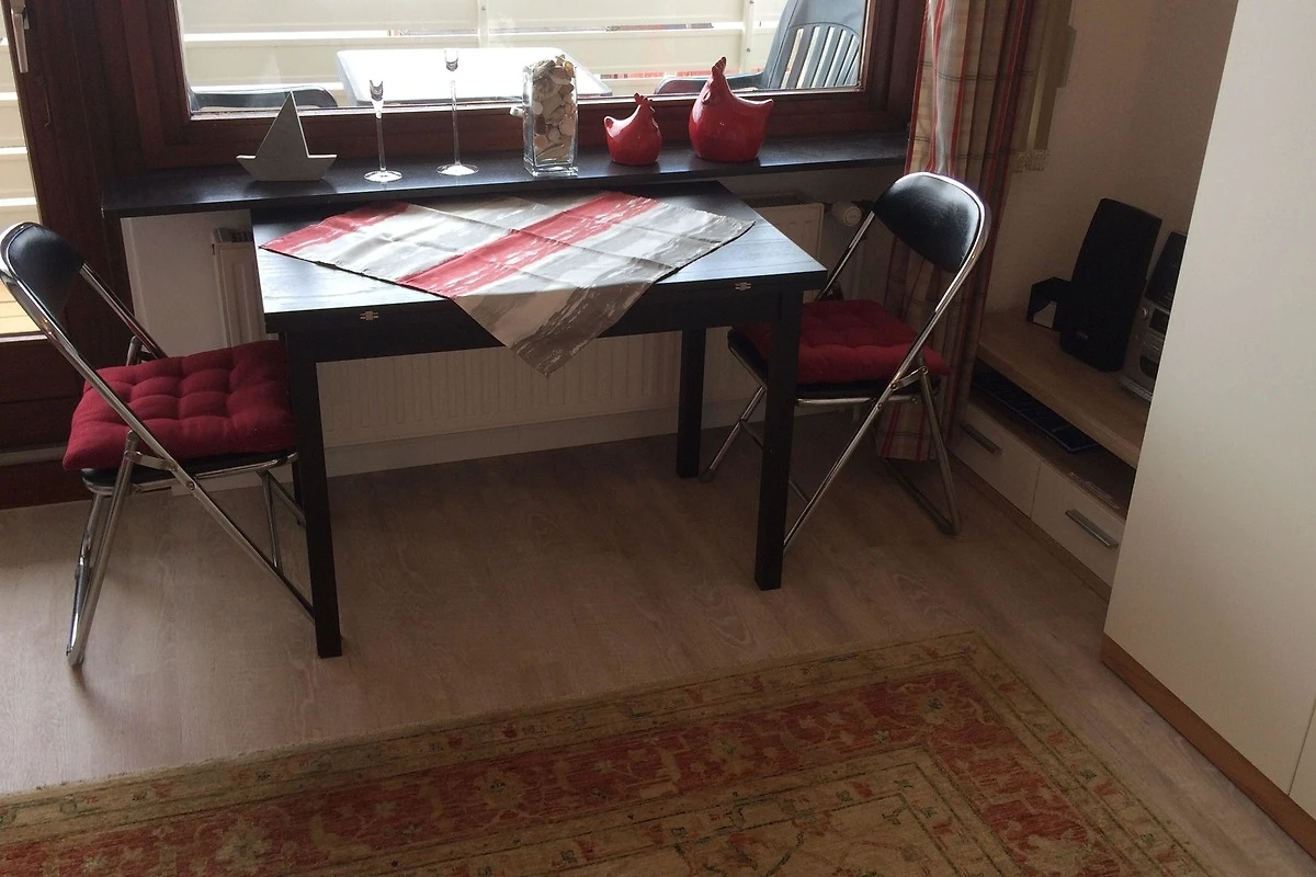 Das Appartement wurde für Feriengäste optimal ausgestattet. Das Wohn-Schlafzimmer ist hell und geräumig. Moderne Schrankklappbetten sorgen tagsüber für Platz und nachts für einen guten Schlaf. Gemütlich wird es auf dem roten Sofa oder dem geschützten und überdachten Balkon. Vom Essplatz aus geniessne Sie den Aufgang der Sonne und den Weitblick in Richtung Festland. Selbstverständlich verfügt das Appartement über eine Stereoanlage und einen Flachbildschirmfernseher sowie über WLan.