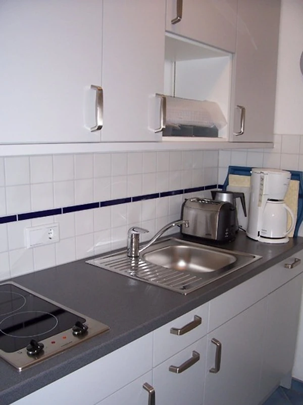 Die moderne Einbauküche verfügt über Herd, Kühlschrank, Geschirrspüler und eine Mikrowelle. Das Vollbad ist funktionell eingerichtet.