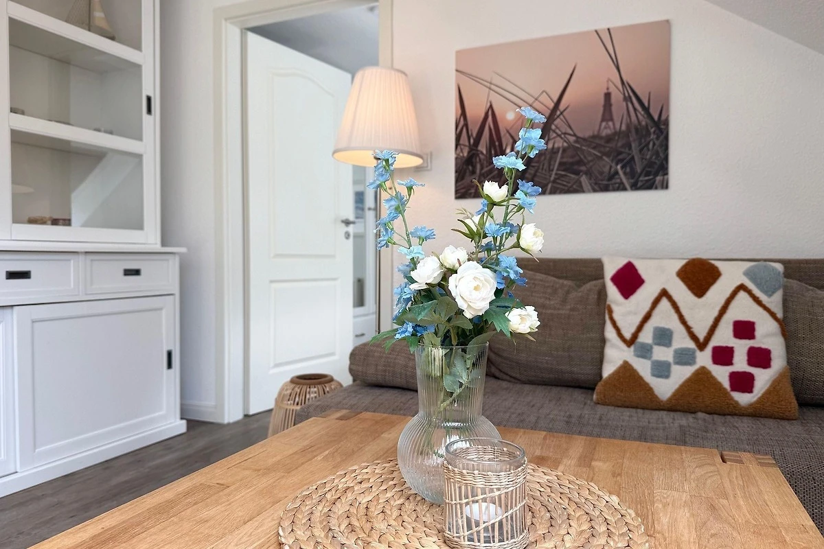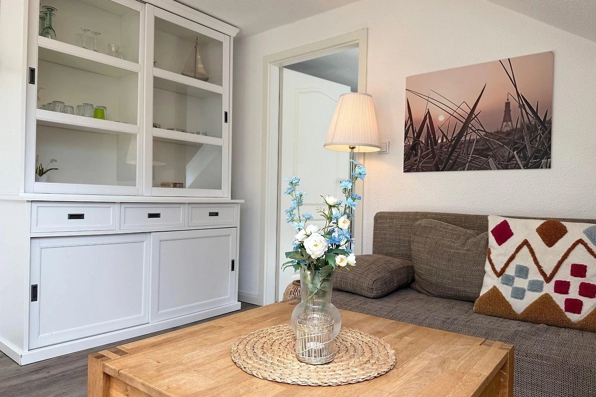 Die freistehende Ferienwohnung bietet einen idyllischen Gartenblick und einen einladenden Aussenbereich mit einem gemütlichen Strandkorb. Ein Holzkohlegrill steht bereit, um unvergessliche Grillabende zu geniessen. Diese Unterkunft verspricht eine ruhige Auszeit in schöner Umgebung und bietet den perfekten Rahmen für erholsame Tage am Strand oder im Grünen. Ideal für entspannte Stunden im Freien.