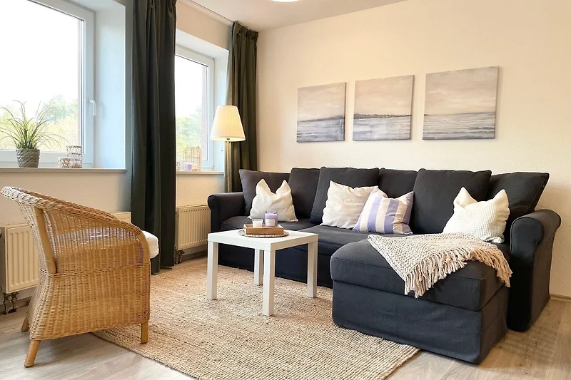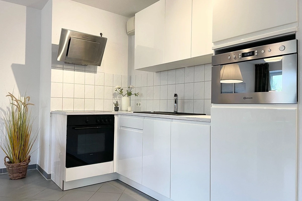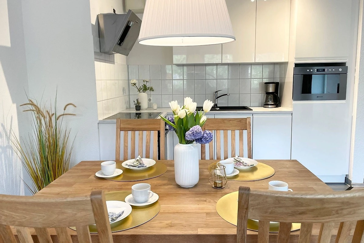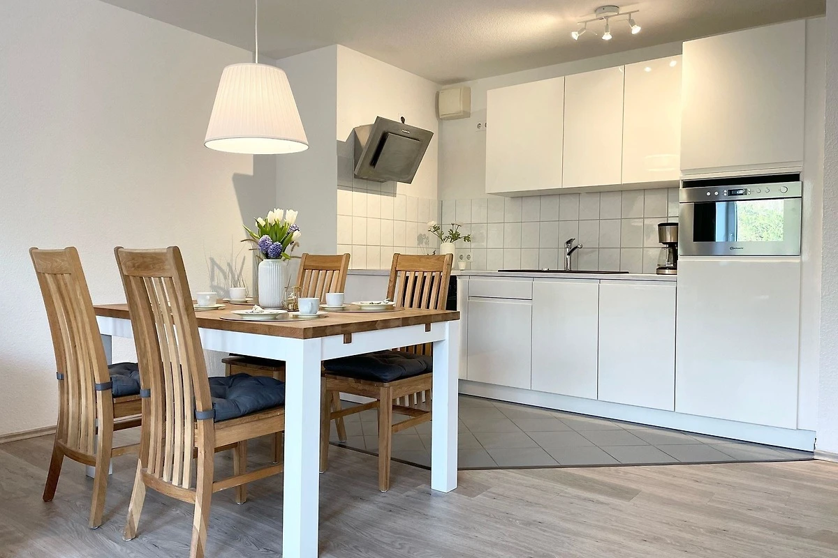 Die Ferienwohnung bietet eine moderne und allergikergeeignete Ausstattung, ideal für erholsame Aufenthalte. Der offene Wohnraum mit einem gemütlichen Sofa und Sessel lädt zum Verweilen ein. Der Esstisch im angrenzenden Bereich ist perfekt für gemeinsame Mahlzeiten. Die offene Küche ist mit einem Geschirrspüler, Elektro-/Gasherd, Backofen, Mikrowelle, Kühlschrank, Kaffeemaschine und Toaster bestens ausgestattet. Ein Duschbad und eine zusätzlich vorhandene Badewanne sorgen für entspannende Momente. Das Schlafzimmer mit einem komfortablen Doppelbett sowie das Wohnschlafzimmer mit einer Schlafcouch bieten Platz für bis zu vier Personen. Weitere Annehmlichkeiten sind WLAN, HiFi-Anlage, TV und eine Waschmaschine mit Wäschetrockner. Ein Fahrstuhl sowie Rauchmelder und Staubsauger sind ebenfalls vorhanden, während Brettspiele für Unterhaltung sorgen. Die perfekte Kombination aus Komfort und Funktionalität macht diese Ferienwohnung zu einem idealen Rückzugsort.