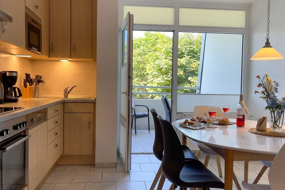 Die Ferienwohnung "Haus Dortmund FeWo 1" in Cuxhaven-Duhnen bietet auf 63 m² Platz für bis zu 6 Personen und ist ideal für Familien und Gruppen. Sie verfügt über einen offenen Wohnbereich mit einem gemütlichen Schlafsofa und einem Esstisch, sowie eine gut ausgestattete Küche mit einem 4-Platten-Herd, Backofen, Mikrowelle, Kühlschrank mit Gefrierfach, Spülmaschine und weiteren Küchenutensilien. Zwei Schlafzimmer befinden sich im Obergeschoss, ergänzt durch zwei Badezimmer – ein Gäste-WC im Erdgeschoss sowie ein Dusch-/Bad im 1. Stock. Ein überdachter Balkon ermöglicht es, die Aussicht ins Grüne zu geniessen. Für zusätzlichen Komfort steht eine Waschmaschine zur Verfügung. Gemeinschaftliche Fahrradräume sind im Haus vorhanden. Diese gut ausgestattete Unterkunft ist der perfekte Ausgangspunkt für entspannende Tage an der Nordsee.