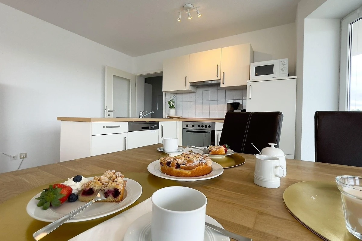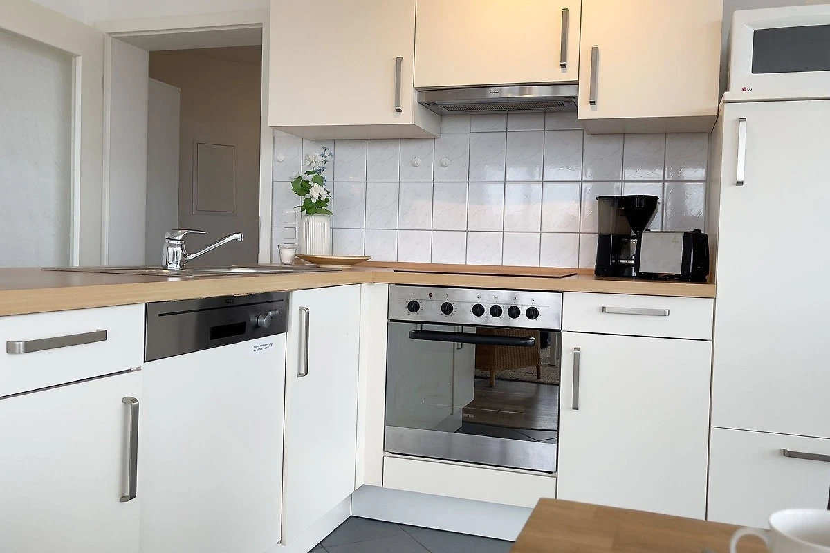 Die Ferienwohnung D1.5 im Haus Nordseebrandung bietet auf 84 m² ausreichend Platz für bis zu 6 Personen. Sie verfügt über zwei separate Schlafzimmer sowie ein Schlafsofa im Wohnbereich, ideal für Familien oder Gruppen. Die offene Küche ist modern ausgestattet mit Herd, Ceranfeld, Backofen, Spülmaschine und Kühlschrank mit Gefrierfach. Der Wohnbereich lädt mit einer gemütlichen Sofaecke zum Entspannen und Geniessen des Meerblicks ein.
