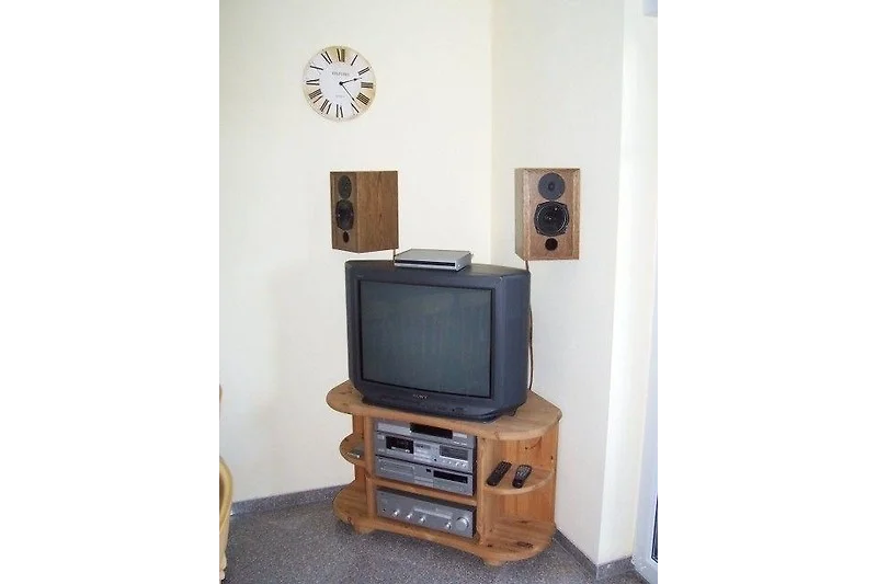 In der hauptsächlich im Erdgeschoss gelegenen Wohnung finden 4 Personen auf 62 qm bequem Platz. Im grossen Wohn- und Essbereich können Sie auf der bequemen Couchgarnitur entspannen. Gerade in den Wintermonaten liefert hier ein Kaminofen eine besonders gemütliche Atmosphäre. Ansonsten stehen Ihnen auch jeder Zeit ein Fernseher und eine Stereoanlage für Ihre Unterhaltung zur Verfügung. Im Essbereich finden alle Gäste dieser Ferienwohnung bequem Platz. In der integrierten amerikanischen Einbauküche können Sie Ihre Urlaubsmahlzeiten zubereiten. Hierfür steht Ihnen sogar neben dem Backofen eine Mikrowelle zur Verfügung sowie vor allem für nach dem Essen sehr praktisch - eine Spülmaschine.