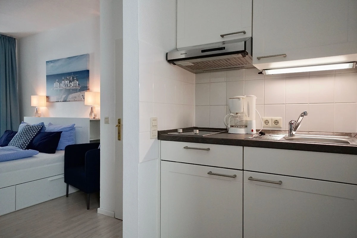 In der modernen Pantryküche finden Sie neben einem Kühlschrank, Kaffeemaschine und Wasserkocher sogar ein Kochfeld, um kleine Mahlzeiten zuzubereiten.