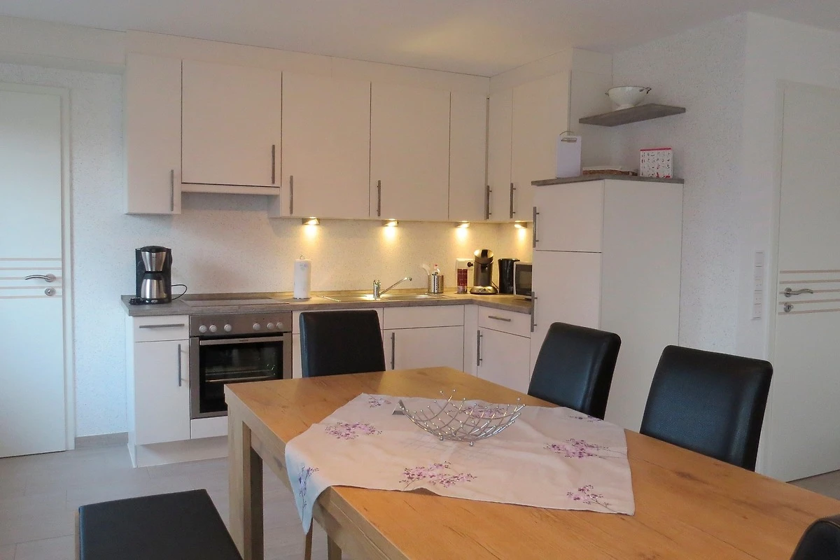 Das Herzstück des Hauses ist das Wohnzimmer mit einer offenen modernen Küche kombiniert sowie einer grosszügigen Essecke. Im Haus sind grosse Fenster die viel Licht in die Räume lassen.
