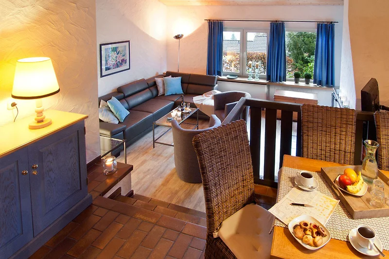 Das grosszügige Wohnzimmer mit Leder-Sitzecke mit offenem Kamin und gesondertem Essbereich lädt zu gemütlichen Abenden ein.