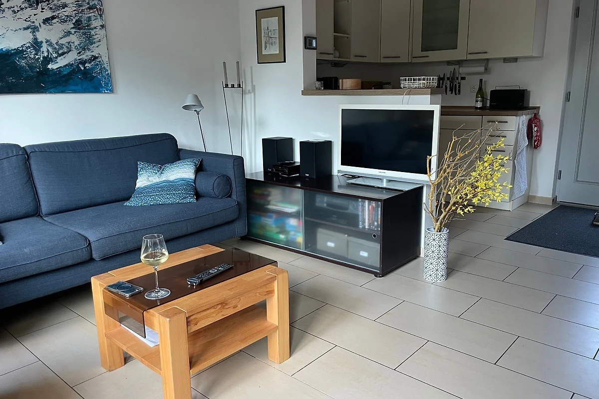 Vom Wohnzimmer abgehend gibt es eine sonnige Terrasse mit Westausrichtung hinter einer geschützten Buchenhecke, die im Sommer zum Grillen oder Sonnenbaden einlädt.