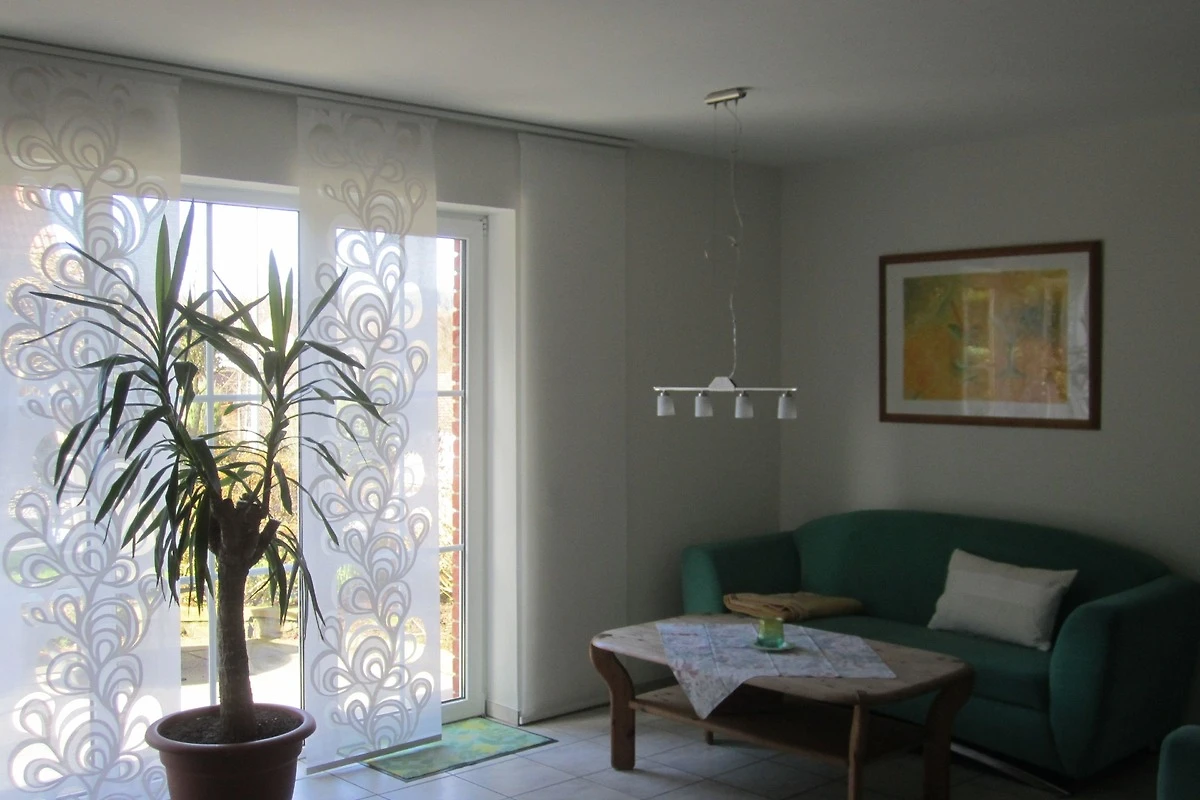 Die Ferienwohnung besteht aus einem hellen Wohn-Schlaf-Raum (1 Doppelbett, teilbar in 2 Einzelbetten), einer komplett eingerichteten Küche mit Essecke im Erker, Bad und einem Abstellraum. Eingang ebenerdig.