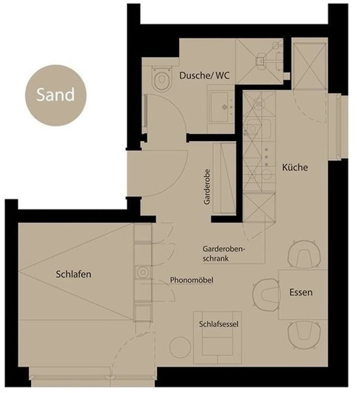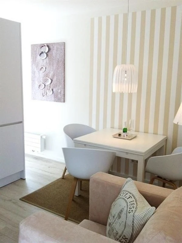 Das Appartement Sand verfügt über einen individuell gestalteten Wohn-, Schlaf- und Essbereich mit offener Küchenzeile.
