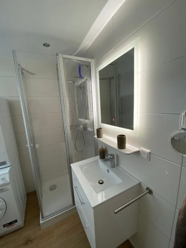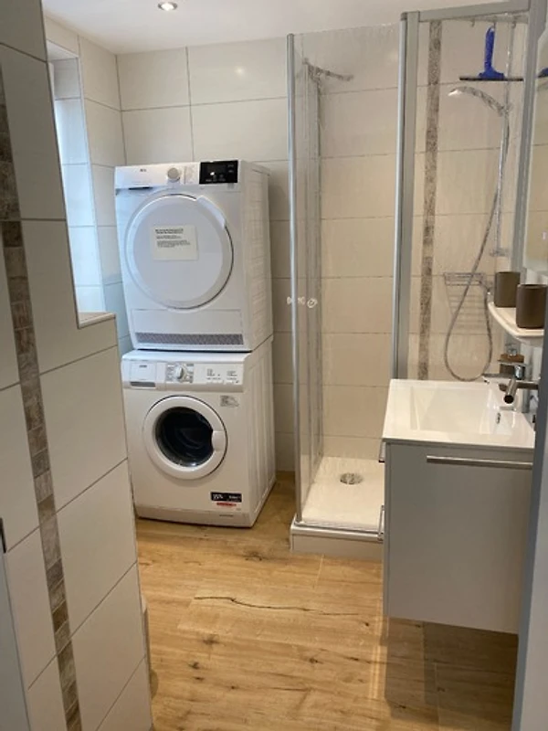 Das Badezimmer verfügt über eine Dusche und ein WC. Eine Waschmaschine und ein Wäschetrockner stehen den Gästen für ein kleines Entgelt auch zur Verfügung. Bettwäsche und Handtücher stellen wir Ihnen zur Verfügung.