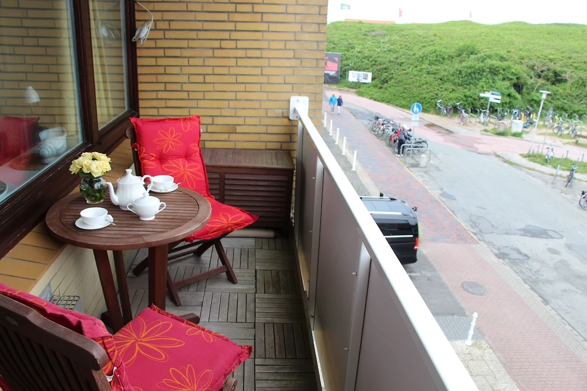 Der grosse Balkon ist mit Sitzgelegenheiten und einem kleinen Tisch möbliert. Auflagen sind vorhanden. Zu der Wohnung gehört ein kostenpflichtiger Parkplatz hinter dem Haus. Dort sind ebenso Abstellmöglickeiten für Fahrräder der Gäste des Hauses vorhanden.