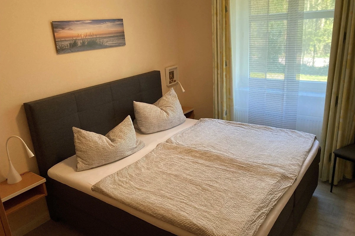 Das helle Schlafzimmer ist mit einem grossen Boxspring-Bett (1,80 x 2,00 m) eingerichtet, auf dem Sie nach einem ereignisreichen Urlaubstag einen erholsamen Schlaf finden. Ihre Urlaubsgarderobe können Sie bequem im geräumigen Kleiderschrank verstauen.