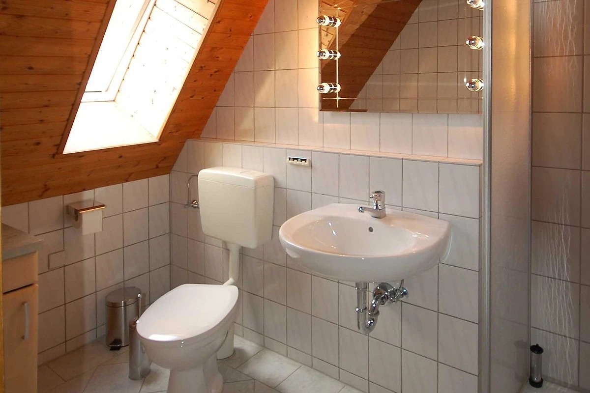 Das Badezimmer ist mit einer Dusche, WC und Waschbecken versehen.