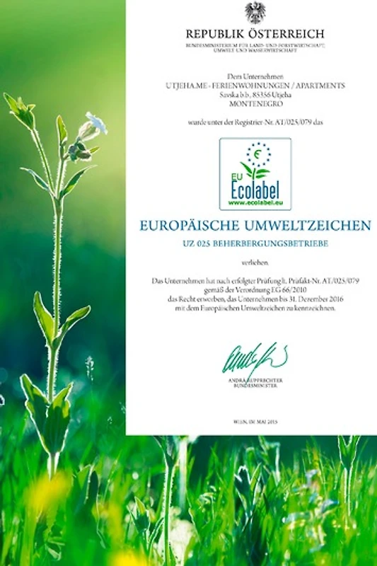 Die Ferienwohnung ist mit offiziellen 4 Sternen kategorisiert und zusätzlich, als erstes Ferienhaus in Montenegro, mit dem europäischen Umweltzeichen "EU Ecolabel" zertifiziert. Zahlreiche weitere nationale und internationale Auszeichnungen garantieren einen perfekten Urlaub.