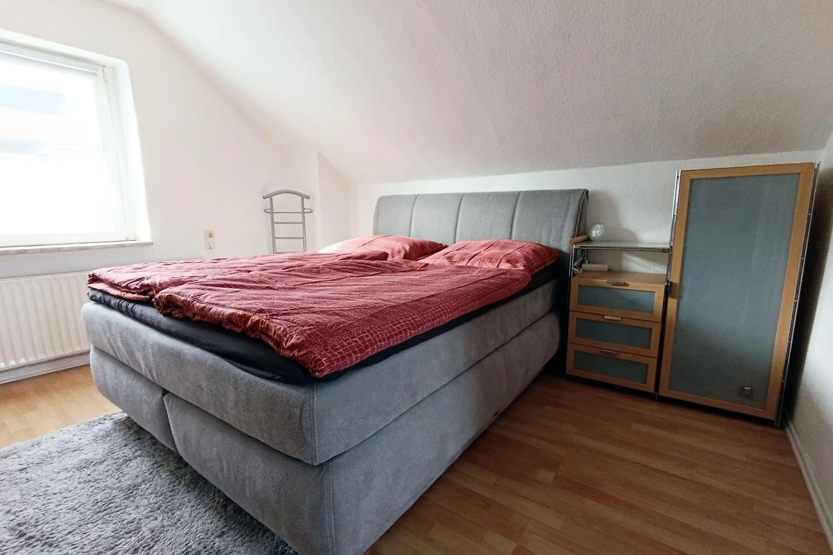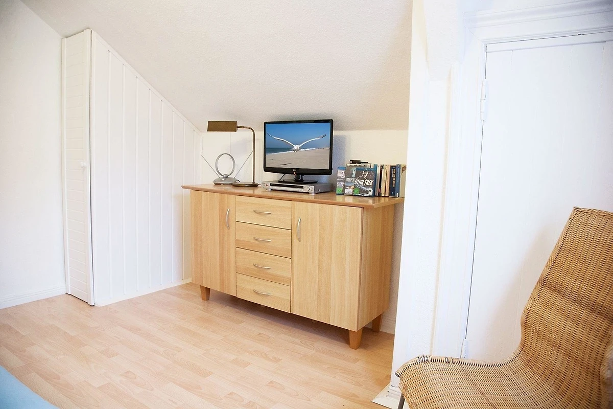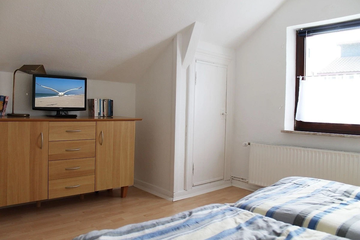 Im Obergeschoss ist ein Schlafzimmer mit einem gemütlichen Boxspringbett und einem weiteren TV und DVD Player, ausgestattet. Hier können Sie auch ohne Probleme ein Kinderbettchen aufstellen. Für einen weiteren Schlafplatz sorgt ein weiteres Einzelbett im Vorraum, auch als Sofa nutzbar.