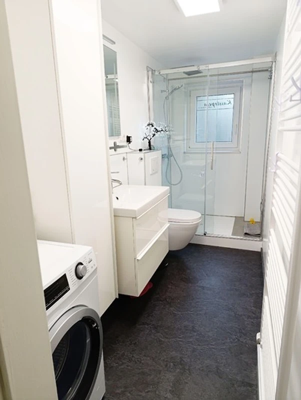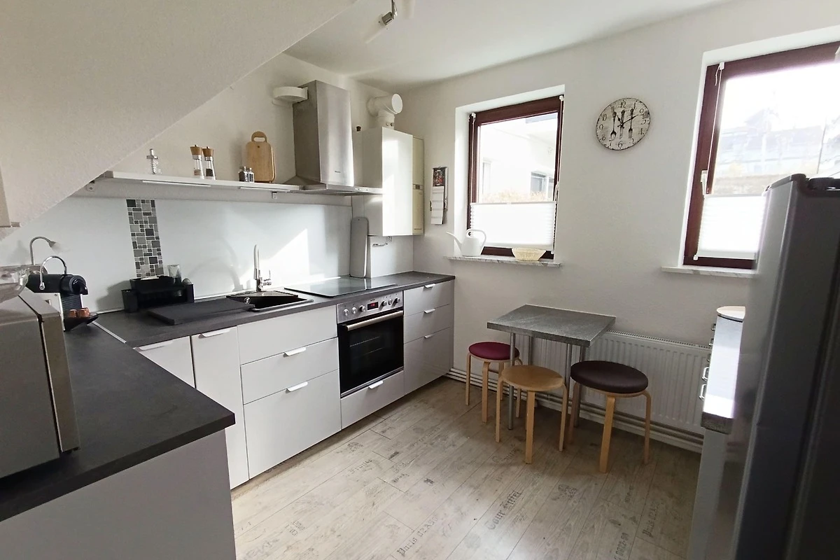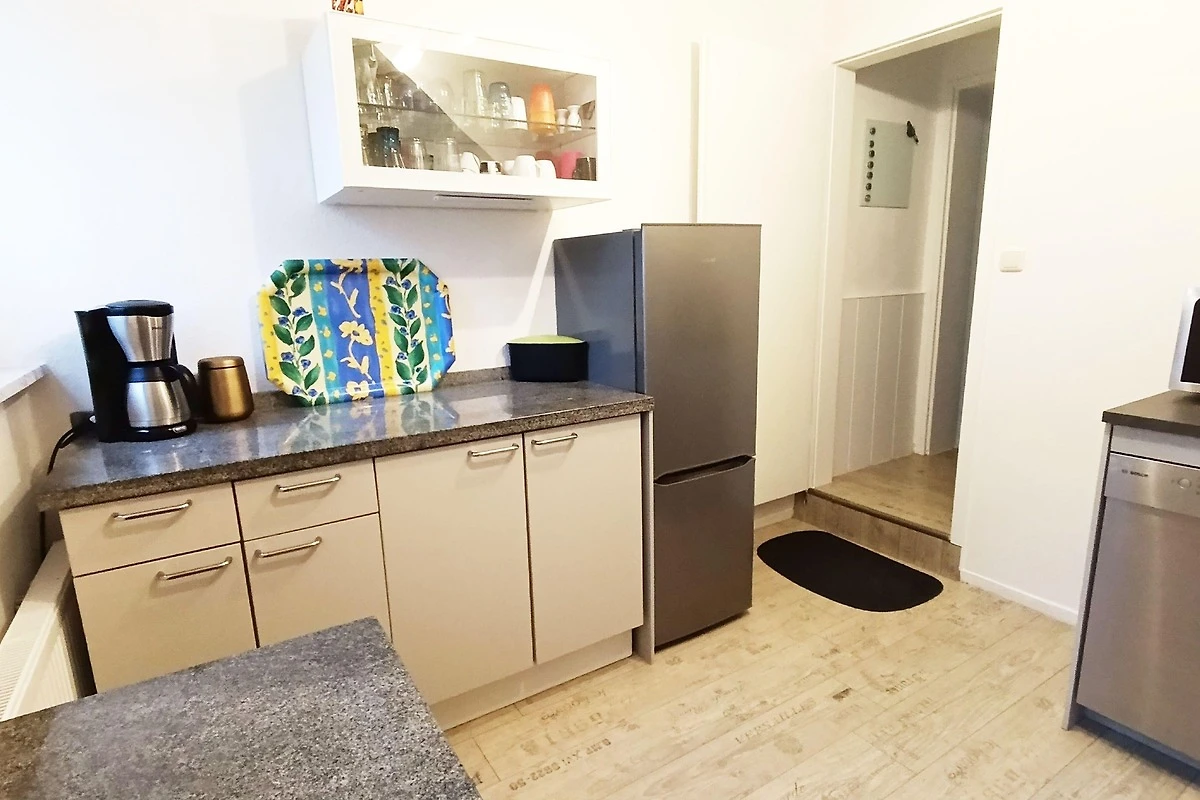 Die separate Küche ist modern eingerichtet und bietet Ihnen genügend Platz, um ein leckeres Essen zuzubereiten. Hierfür stehen Ihnen ein Induktionsherd, ein grosser Kühlschrank mit Eisfach, ein Geschirrspüler, eine Mikrowelle und vieles vieles mehr zur Verfügung. Ausserdem finden Sie ausreichend Geschirr und Besteck vor. Im Erdgeschoss finden Sie auch das Badezimmer mit Dusche und WC vor.