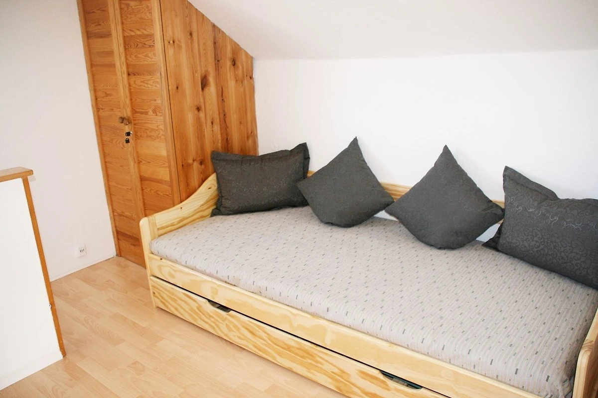 Im Erdgeschoss steht Ihnen ein grosszügiges Wohnzimmer mit einem grossem Esstisch, einem Schrankbett 160/200 cm mit zwei einzelnen Matratzen, eine gemütlichen Sitzecke, ein DVD-Player (BluRay) und ein Flatscreen-TV zur Verfügung.