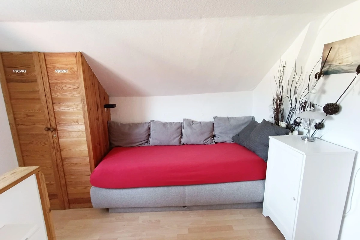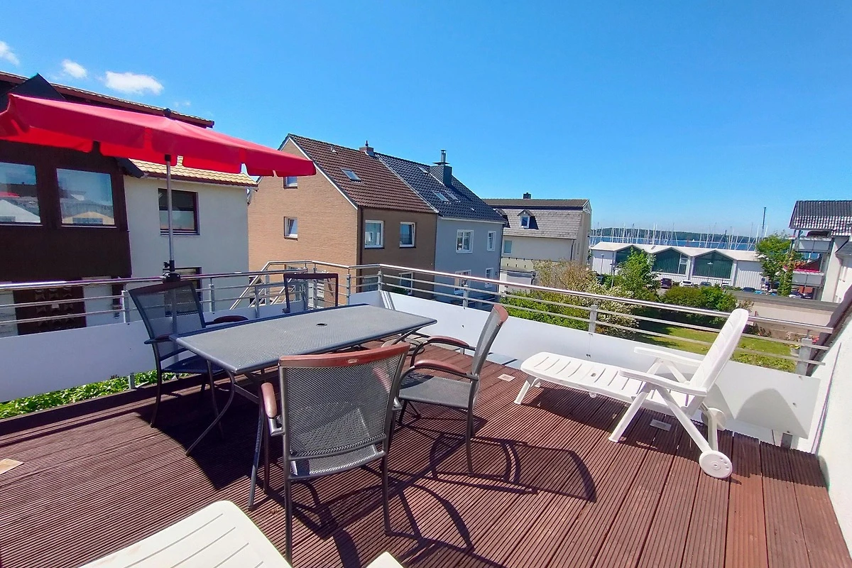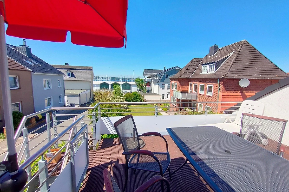 Im Obergeschoss des Hauses finden unsere Gäste eine grosse Sonnendachterrasse mit wundervollem Blick auf die Kieler Förde. Hier stehen Ihnen ein Strandkorb, Gartenmöbel und ein Sonnenschirm zur Verfügung.