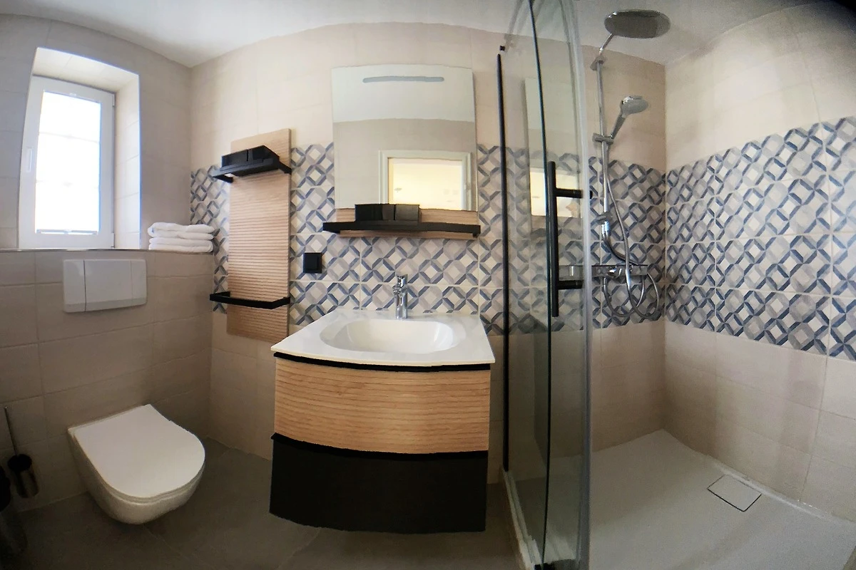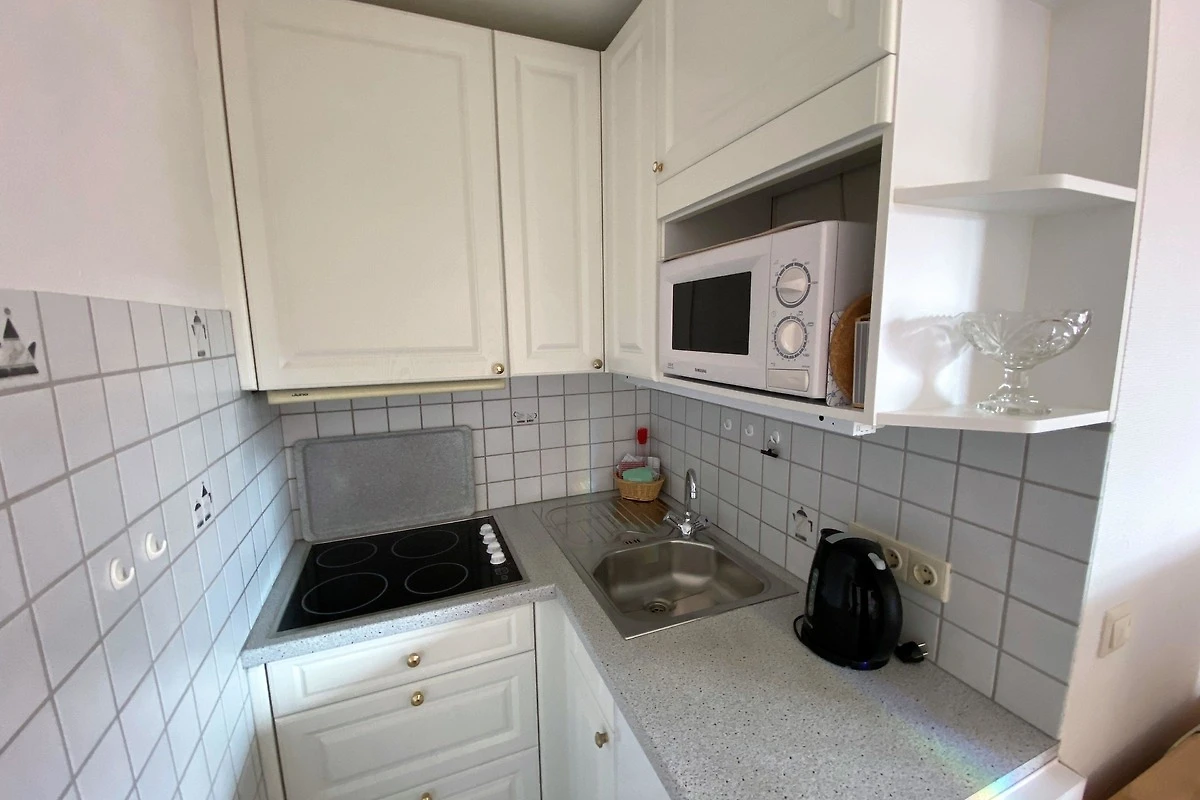 Die Wohnung 3 ist hell und modern eingerichtet mit einem Doppelbett (1,80 x 2 m), einem bequemen Essplatz am Fenster und einer gemütlichen Leseecke mit Sofa. Die kleine Küchenzeile ist komplett ausgestattet (keine Spülmaschine). SAT-TV sowie Internetradio mit Bluetooth sind vorhanden. Das 2022 komplett neu renovierte Bad mit Dusche / WC und Fussbodenheizung rundet das Bild eines stilvoll und modern eingerichteten Appartments ab. Laminatfussboden im Wohn- / Schlafraum. Vor der Tür ist eine kleine Terrasse, die von den Gästen von Wohnung 3 und 4 genutzt werden kann. Die Wohnung eignet sich nur für 1- 2 erwachsene Personen, keine Babies
