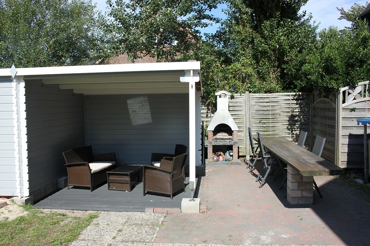 Im Garten befindet sich eine Lounge mit Gartenmöbeln.
