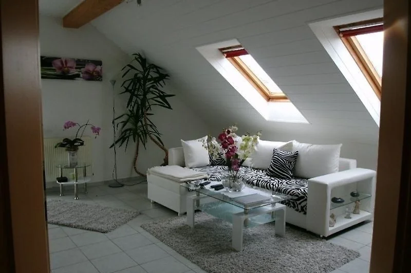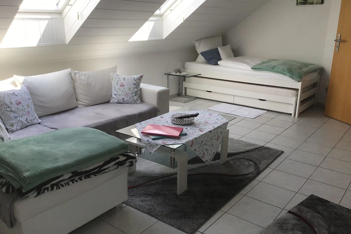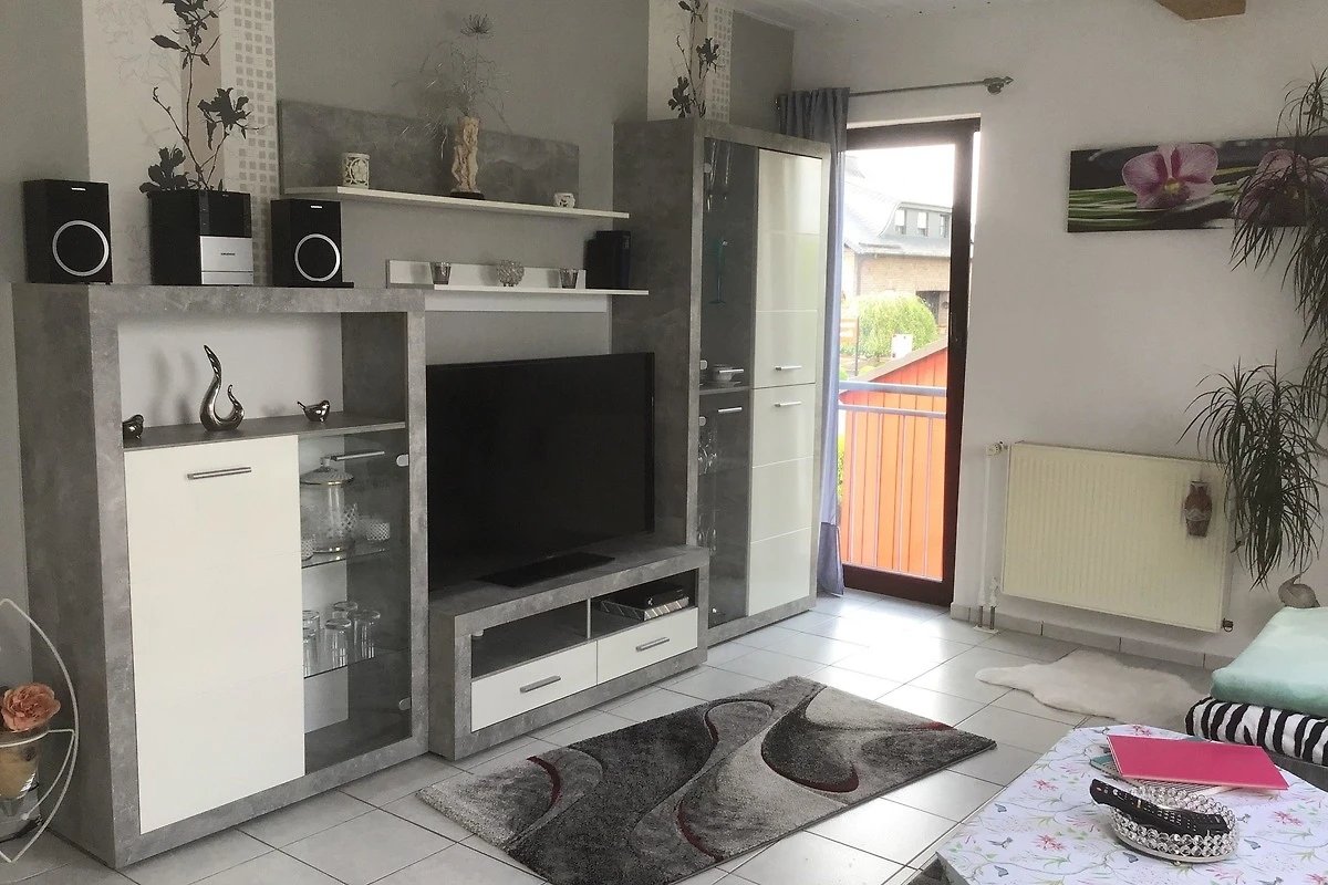 Die Ferienwohnung bietet Ihnen ein gemütliches Wohnzimmer, ausgestattet mit einer Sofa-Ecke und TV.